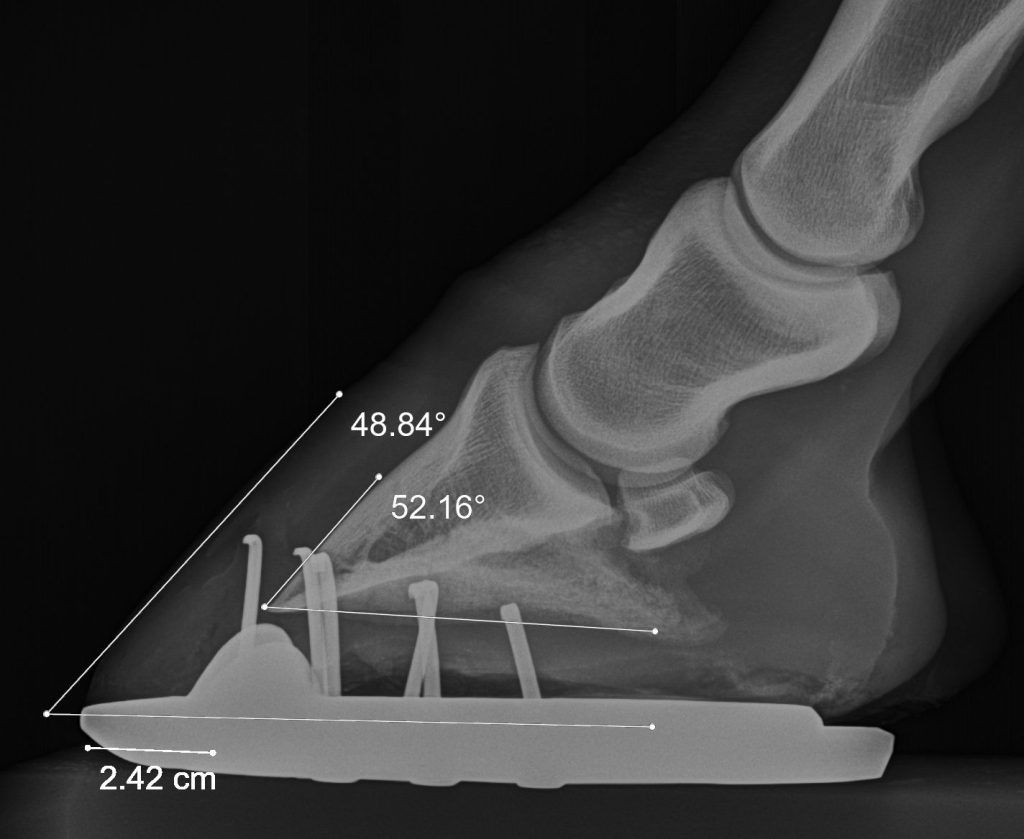 As you can see in the x-ray, he was pretty darn negative in his right hind. His left hind was just barely negative—less than a degree—but either way, this was it. This was the answer we had been searching for. This was the answer for why my horse, who has no glaring conformational flaws to speak of aside from pasterns that are a little too long in the front, who has no kissing spine or neck arthritis or any bony changes anywhere that we’ve looked, has had chronic suspensory issues (which were worse on the right side) and soreness in his SI and back and withers for pretty much the entire time I’ve owned him. I treated the symptoms—he got regular chiro work to keep his back more comfortable, and I did his carrot stretches religiously—but it’s no wonder that we never solved the problem. It’s no wonder that he had such a hard time lifting his back and using himself properly, even though he really did try. He was literally set up for failure from the beginning.
