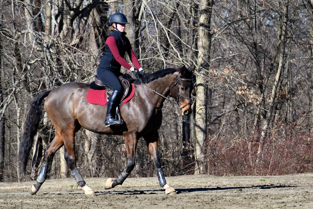 Our vet watched him go under saddle when she came back at the end of November and was pleased with how he was doing, and that was our permission slip to start trying to work the canter back in. Both my trainer and I had seen Cooper gallivanting around his field on the correct lead both ways (with some flying changes thrown in there), so we knew he was feeling better, but doing it under saddle was a bit of a different story. He was definitely stronger, and he could hold it both directions a bit more easily, but he still wanted to swap in the back going into his downward transitions, and he wasn’t convinced that he could soften through his topline at the canter like he did at the trot. I was over there having the internal panic attack that all this money I’d spent had been for nothing, but my trainer had a different response: his muscle memory is all wrong, so put him on the lunge line with a pair of side reins that give him somewhere to go and let him figure it out, and that was what we did.