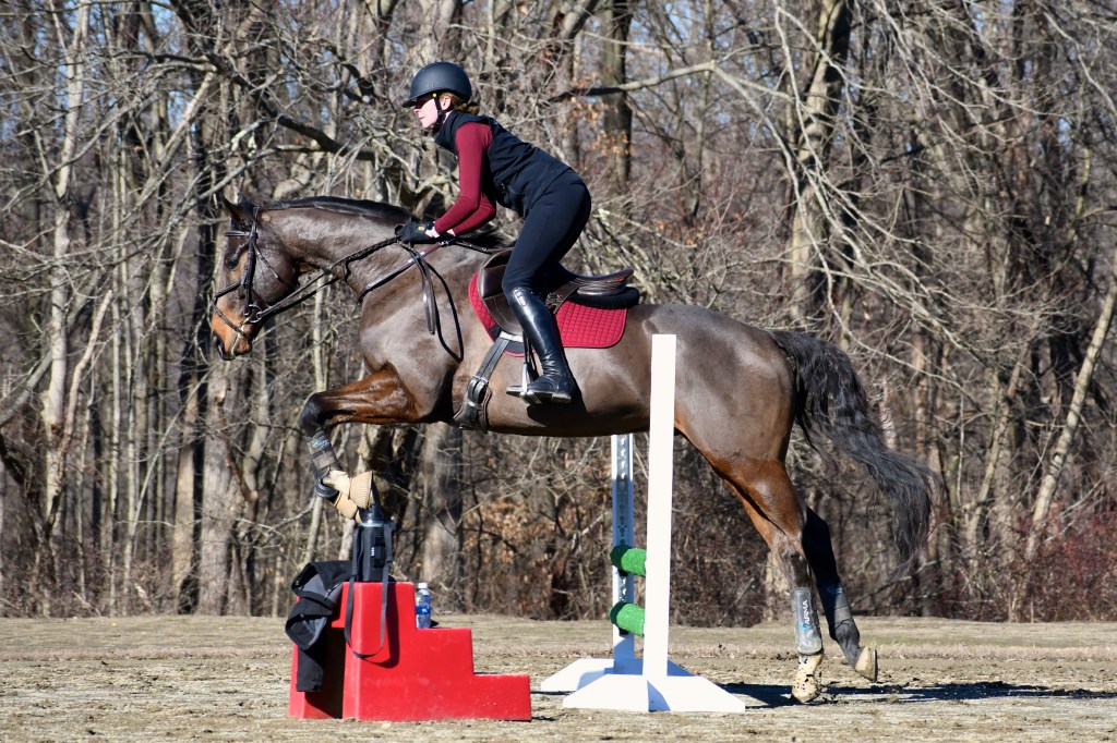 We (meaning my trainer and I) then made the incredibly brilliant decision at the end of January to haul over to Ohio for a gymnastics lesson with a friend of hers. We went into this knowing that Cooper hadn’t jumped properly (or been off-property) in over six months (we’d popped him over a couple of cavalettis the previous week, but that was about it) and that she was bringing her four-year-old who had only been off the track for four months and had been back under saddle for maybe two. With that in mind, we signed up for Intro, but somehow ended up doing what my trainer called Novice questions at Beginner Novice heights. To Cooper’s credit, once we got going and he got over the initial excitement of being out and getting to jump things again, he was very good. It was the first time anyone other than my trainer had coached me while I was on him, and he got the seal of approval from her friend, so I was quite pleased.